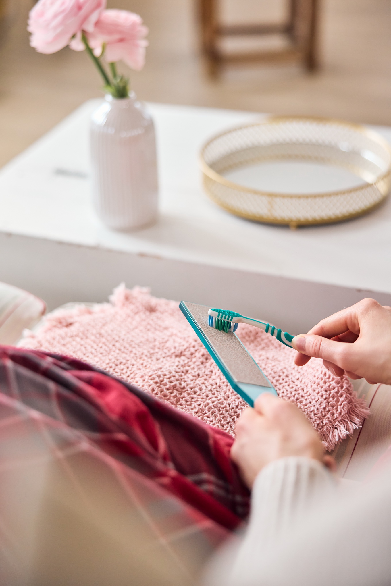 Suha stopala in pete zdrgnite s suho pilo, najprej z grobo temno stranjo in nato s fino svetlo stranjo. Najbolj prizadetim delom kože se pri prvem piljenju raje izognite. Nato stopala sperite z vodo in jih obrišite do suhega. Priporočena uporaba pile je na začetku na pet dni, pozneje na deset do štirinajst dni.